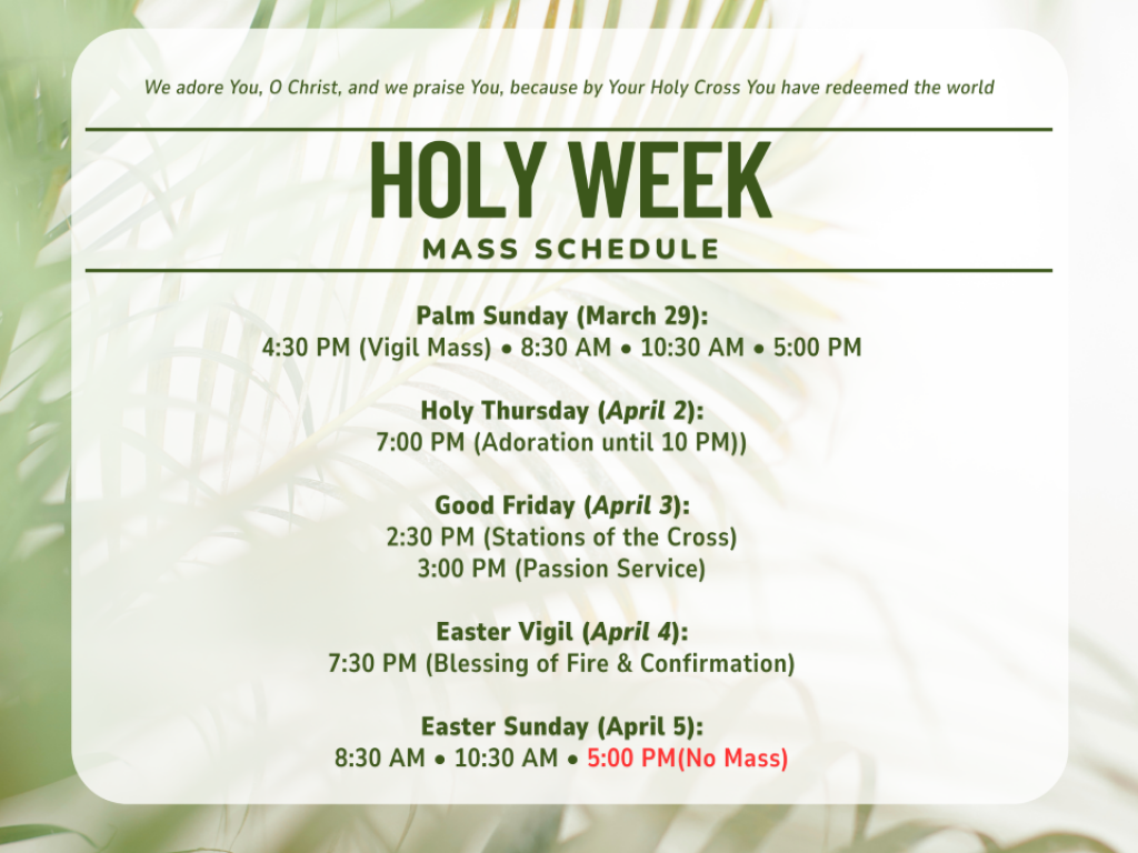 Sat. 4:30PM | Sun. 8:30AM, 10:30AM, 5:00PM